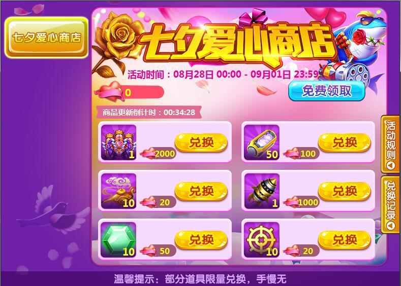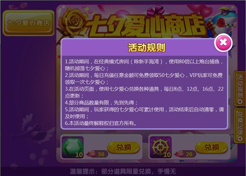 1. 活动期间,在经典模式房间(除新手海湾),使用80倍以上炮台捕鱼,随机掉落七夕爱心;