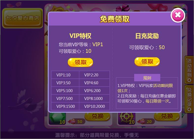 2. 活动期间,每日充值任意金额可免费领取50七夕爱心,VIP玩家可免费领取一次七夕爱心;
